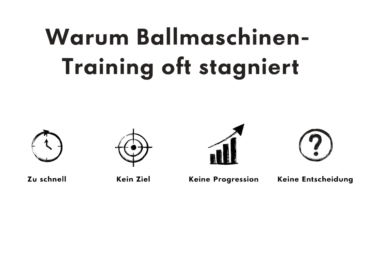 Der Haken: Viele trainieren mit Ballmaschine wie im Film. Tempo hoch, Bälle im Sekundentakt, „ich baller einfach drauf“. Das fühlt sich sportlich an, macht dich aber oft nur besser darin, hektisch zu überleben.