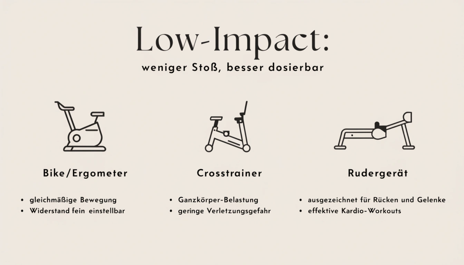 Achte darauf, dass du die Intensität in kleinen Schritten steuern kannst – stufenloser Widerstand, Tempo oder Neigung ist meist besser als „nur Vollgas oder gar nicht“. Stabilität und eine gute Führung können Technikfehler reduzieren, aber sie nehmen dir nicht die Verantwortung ab, sauber zu trainieren. Und „low-impact“ bedeutet: geringe Stoßbelastung, zum Beispiel bei Bike/Ergometer, Crosstrainer oder Rudern. Für viele fühlt sich das angenehmer an als Laufen, aber am Ende entscheidet dein individuelles Empfinden, zusammen mit Technik und Dosierung.