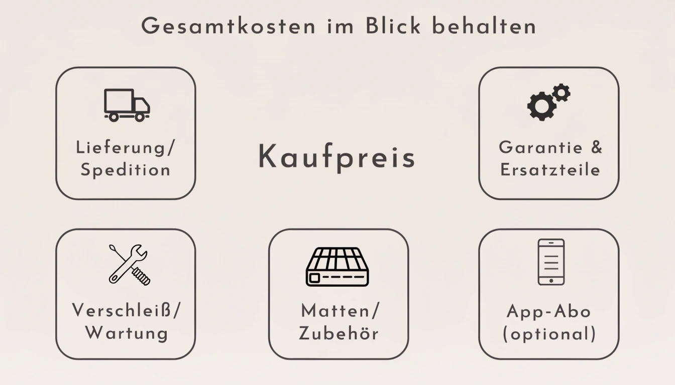 Wenn du in einer Minute prüfen willst, ob du kaufbereit bist, geh diese Punkte einmal gedanklich durch: Ist dein Ziel wirklich klar – Ausdauer, Kraft, Mischung oder Mobilität? Hast du den Platz nicht nur theoretisch, sondern inklusive Bewegungsraum? Passt das Ganze zu deiner Wohnsituation, also Boden, Lärm und Nachbarn? Kannst du die Belastung fein steuern, damit du nicht von „zu leicht“ direkt zu „zu hart“ springst? Bleibt das Gerät in drei Monaten noch sinnvoll, weil Progression möglich ist? Sind Qualität und Service nachvollziehbar (Stabilität, Nutzergewicht, Garantie, Ersatzteile)? Und ist dein Budget realistisch – inklusive Lieferung, Matten und eventuell Abo?