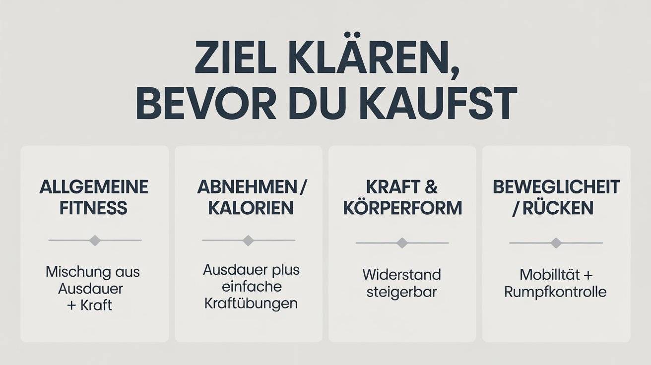Bevor du Preise vergleichst, kläre zuerst eine einfache Frage: Wofür willst du trainieren? Viele Fehlkäufe entstehen, weil das Ziel nur grob im Kopf ist – und dann landet man bei Geräten, die zwar gut aussehen, aber am Alltag vorbeigehen.