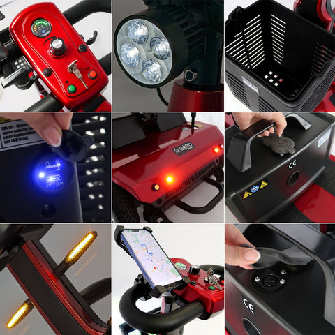 Die Zusatzausstattung, wie zwei USB-Buchsen, Handyhalterung, LED-Licht, Frontkorb und Blinker, ist bereits im Preis inbegriffen
