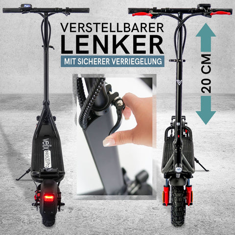 Die Ausstattung des velix rundet das Fahrvergnügen ab. Es steht ein digitaler Tacho mit Anzeige von Ladezustand, Geschwindigkeit und Tageskilometer zur Verfügung. Auf der extra großen und breiten Trittfläche finden auch Schuhgrößen von 45 und mehr bequem Platz. Der individuell höhenverstellbare Lenker ist ein weiteres Highlight dieses E-Scooters. Sowohl kleinere als auch größere Menschen finden hier die für Sie passende Lenkerhöhe. Zusätzlich zeichnet sich die Pro Version des beliebten E-Kick 20 Scooters durch einen extra robusten Aluminium-Rahmen, die helle 36V LED-Beleuchtung und die gummierte Design-Matte für die Trittfläche aus.
